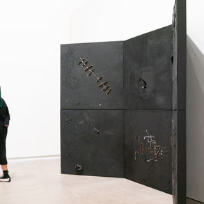 [W]hole is an unapologetic reclamation of my artistic voice and a protest against the psychic wounds inflicted by colonialism, colorism, and capitalism. This 8 x 10.5 x 4 ft wooden structure, shaped like a trifold mirror or room divider, surrounds the viewer—forcing intimate engagement with its scars and sutures.
